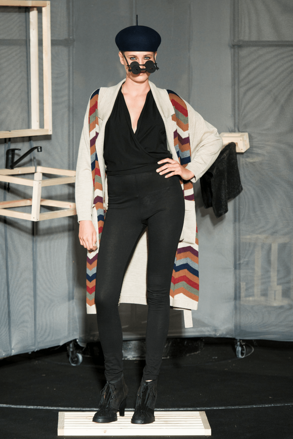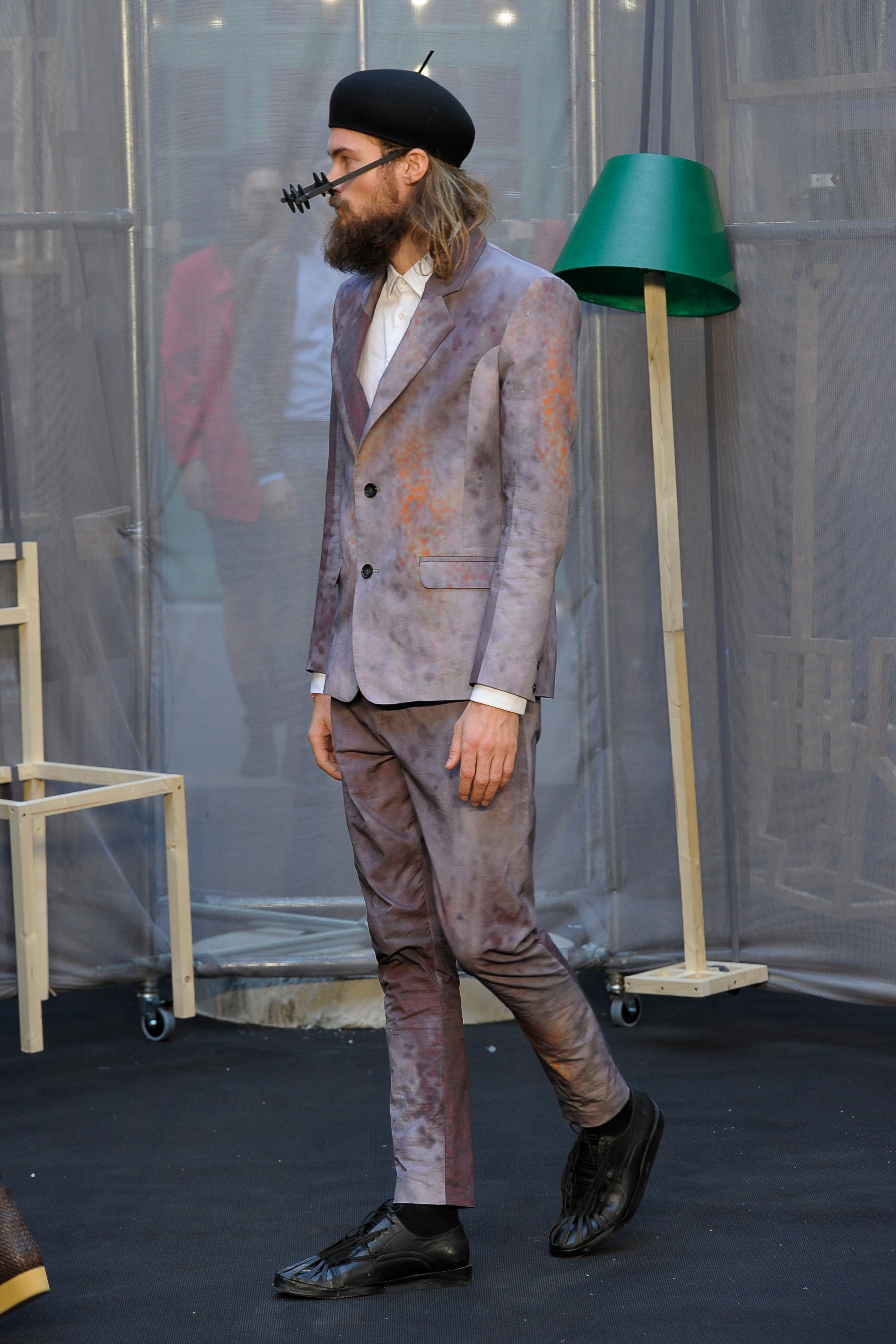 Known through the Benthamian concept of a circular building that plays with observation and self-observation, the word Panopticon derives from the greek “panoptus“, meaning fully visible, all-embracing in a single view. Taken out of the context of strict surveillance and control it was originally intended for, the circular “Panopticon And On“ stage re-arranges and subverts elements of this structure. The SS12 collection itself plays with details from 19th century artisans, miners and carpenters. Apart from these more clear references, the pieces emerge from a very free spirited frame of creativity. Among the inspirational elements of the collection are a long list of arty nonsensical mechanical objects, children’s books illustrations, imagery from films like “Delicatessen” or “Clockwork orange”, and Steve McQueen.